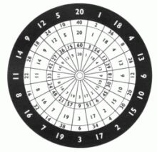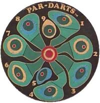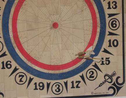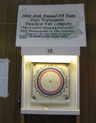 A další zajímavost: Na následujícím terči se hrále stále. V roce 2008 proběhl již 40. turnaj Tresckow American Darts. Terč je níž než obvykle, odhozová čáre je blíže terčí a je zakřivená...